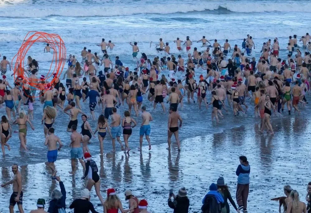 Much to my delight, the sun came out every day and the weather was calm enough for the village to enjoy its traditional Christmas Day Swim (spot me circled in red).